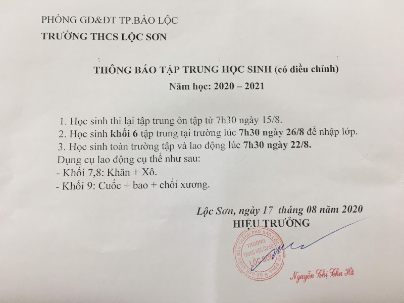 Nhà trường thông báo lịch tập trung học sinh. Năm học: 2020 - 2021. Đề nghị các em học sinh thực hiện nghiêm túc.